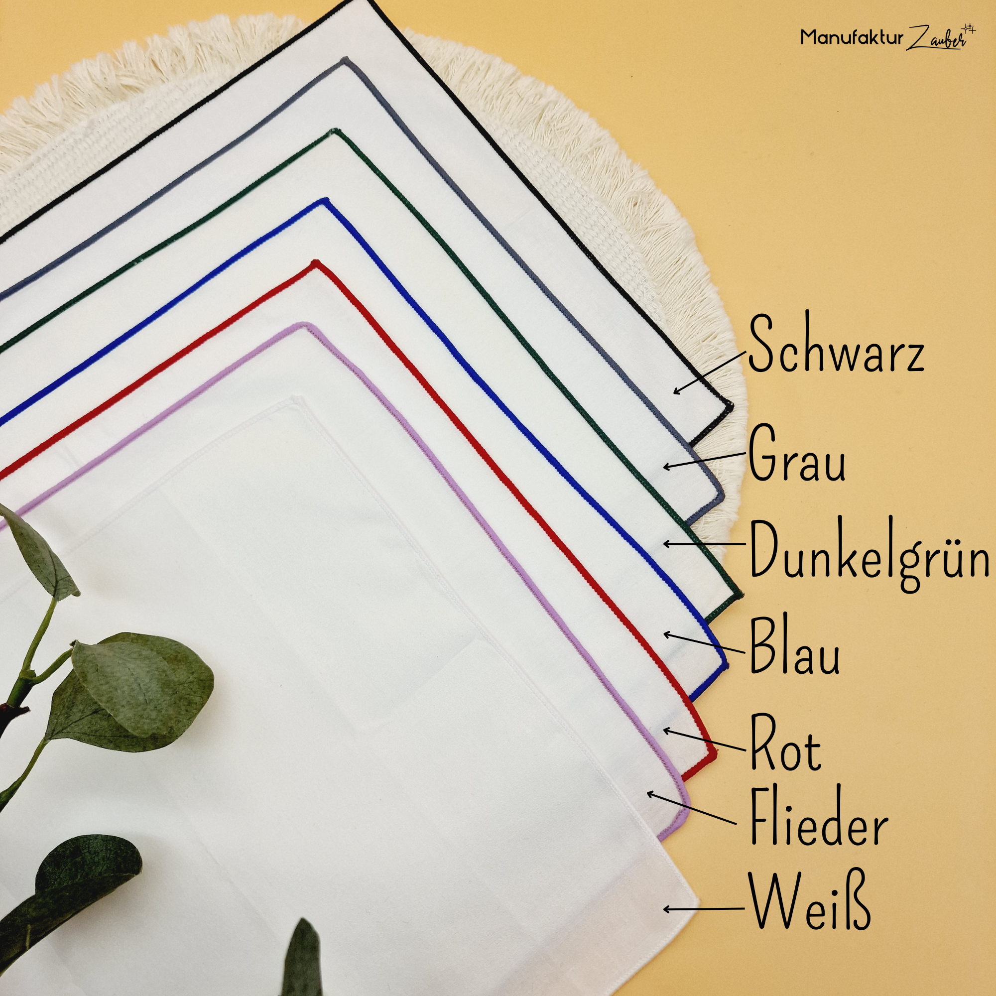 Taschentuch mit Rand in den Farben Weiß, Schwarz, Grau, Dunkelgrün, Blau, Rot, Flieder: Maße 25×25 cm