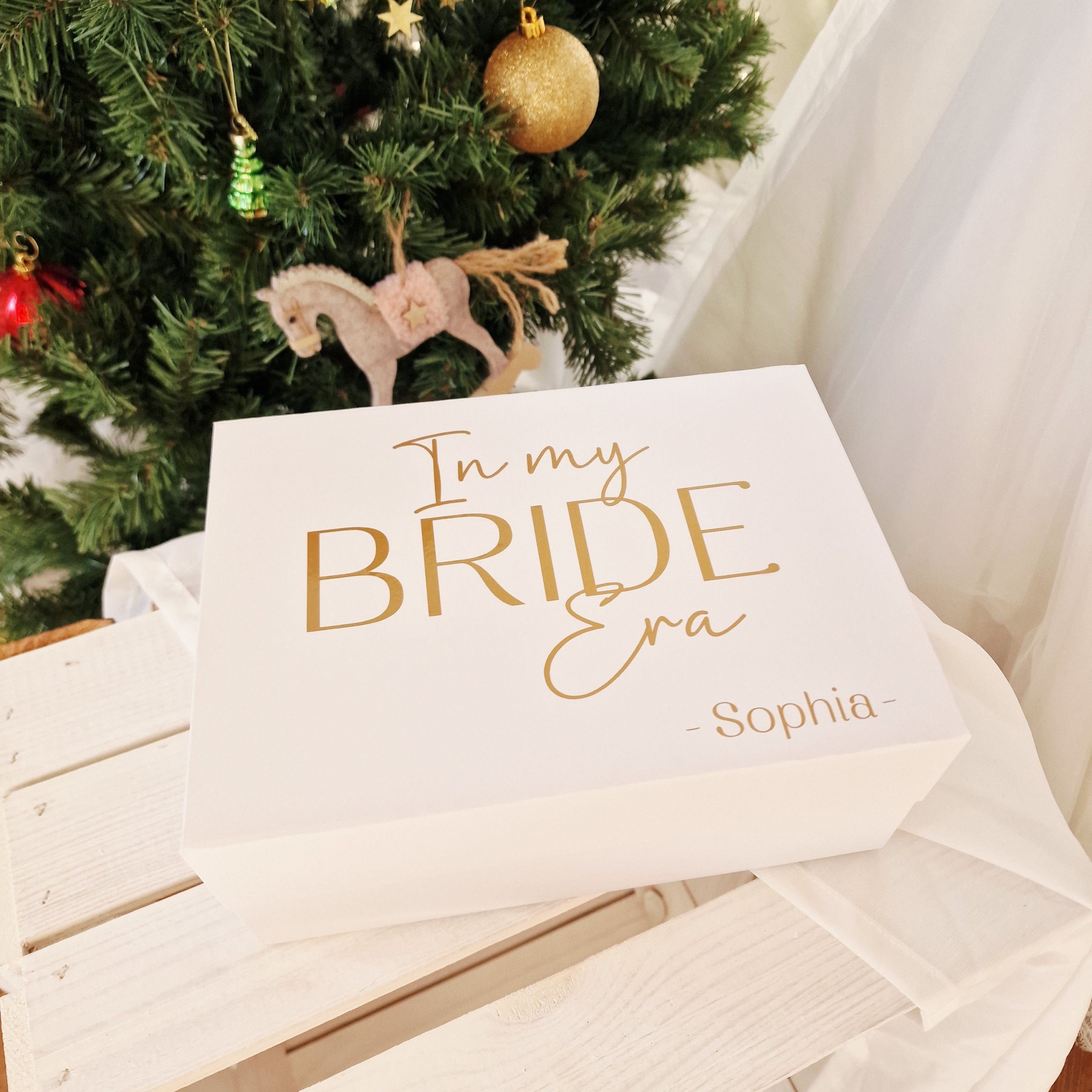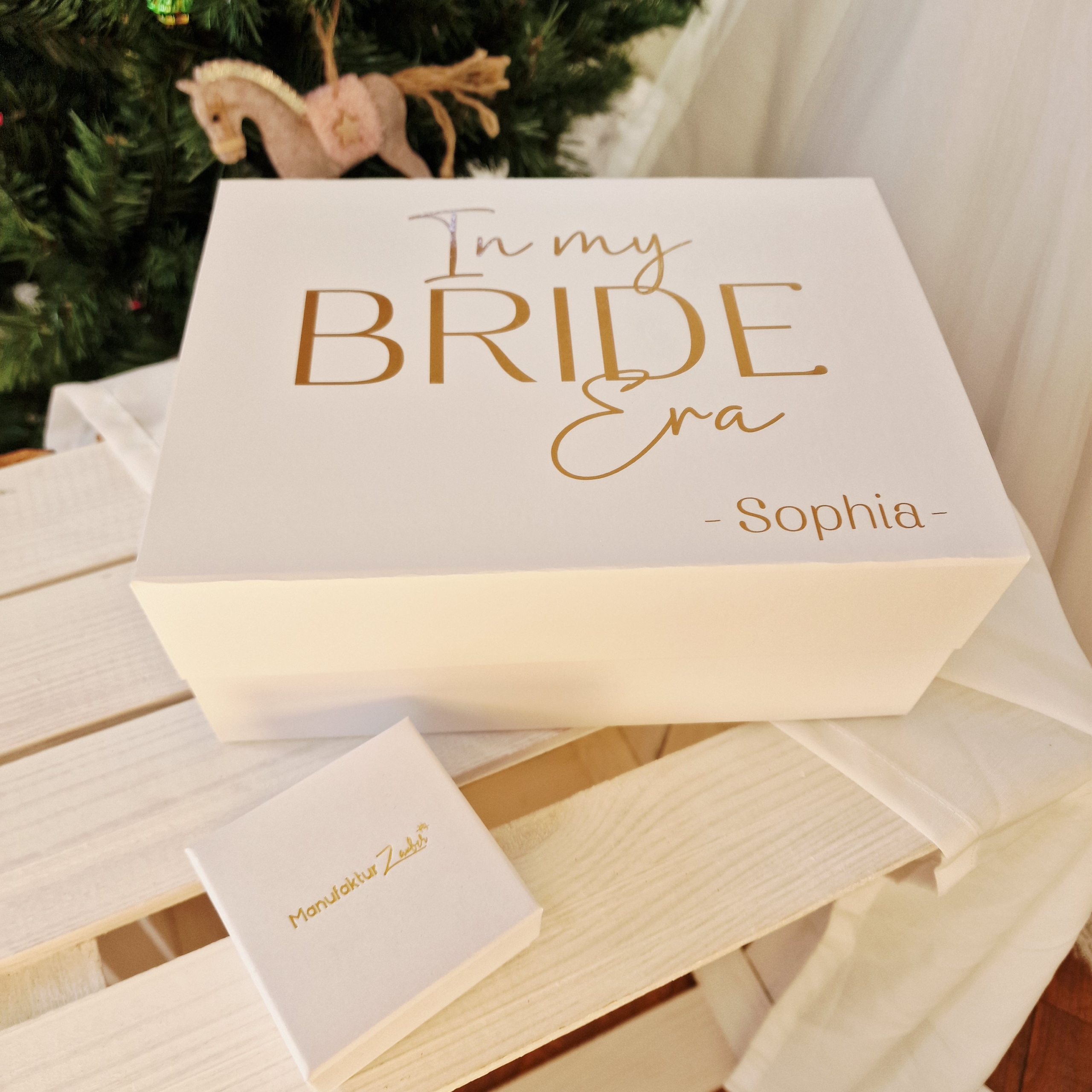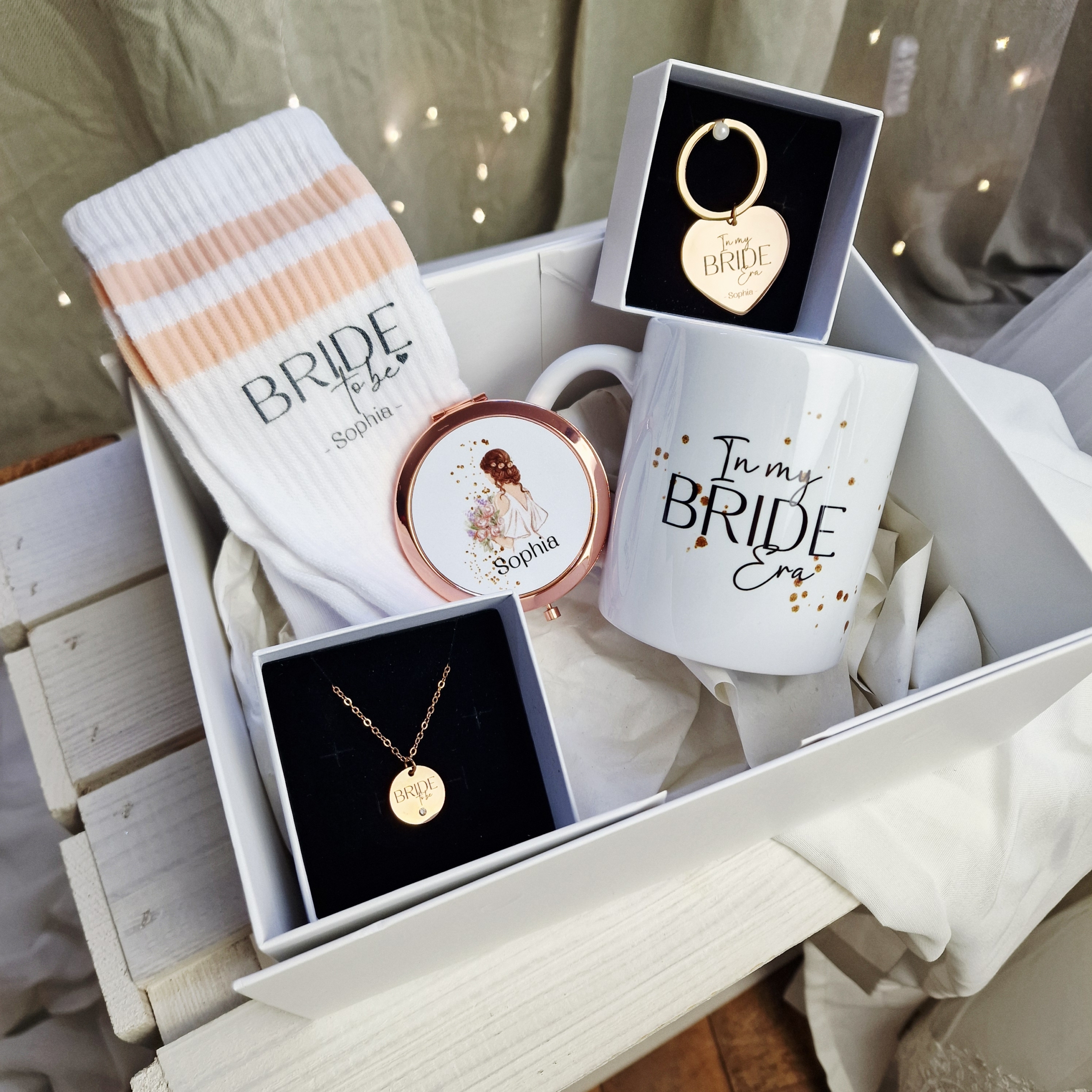 Die Box steckt voller Vorfreude, Persönlichkeit und Emotionen: 5 hochwertige, bereits einzeln verpackte Geschenke, alle personalisiert mit dem Namen der Braut. Jedes Geschenk wurde so ausgewählt, dass es ihre Bride Era noch besonderer macht – mit kleinen Momenten der Selbstliebe, Freude und Magie.