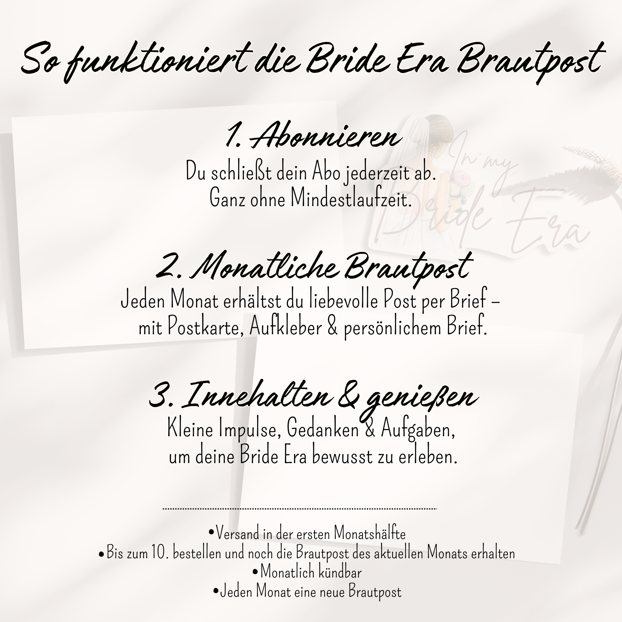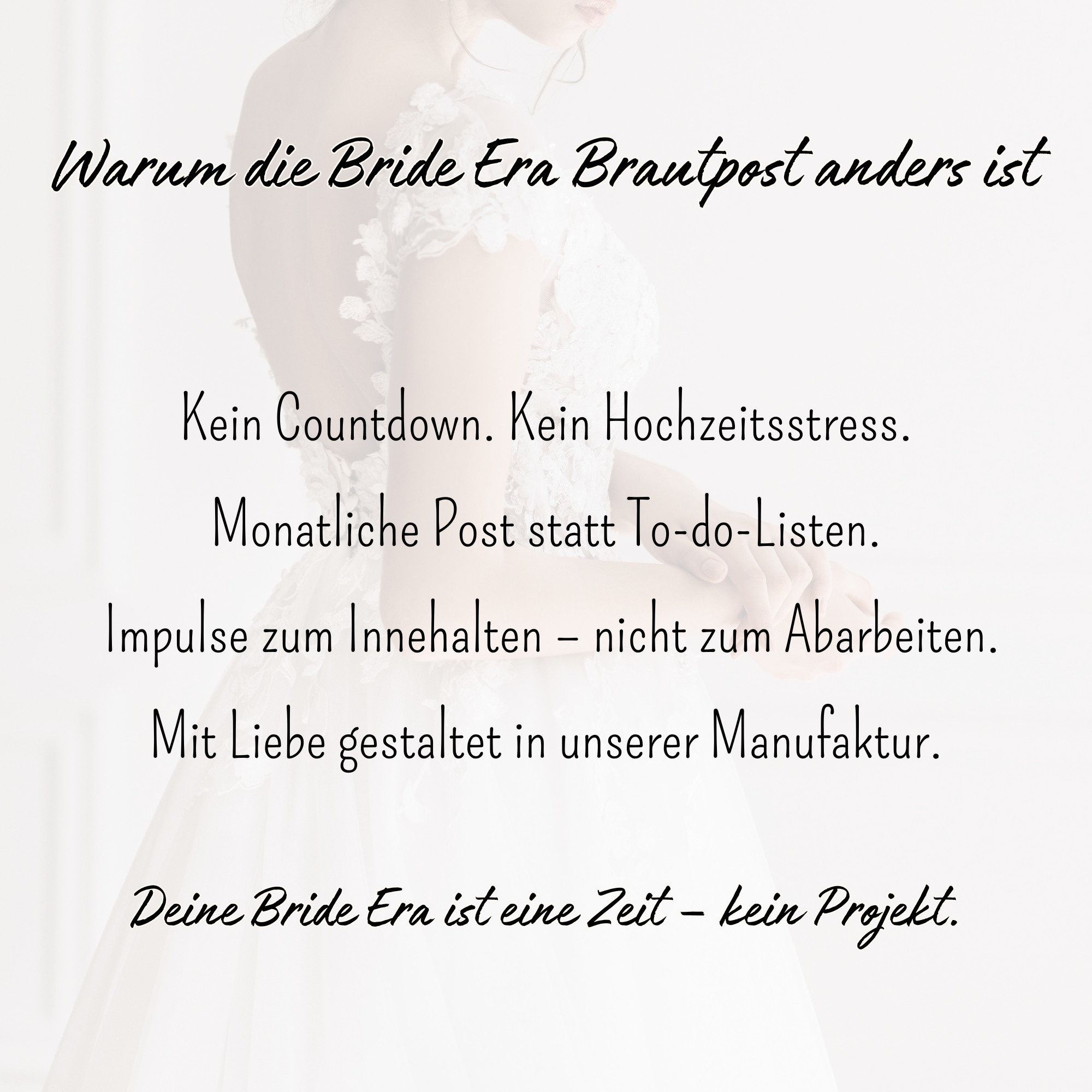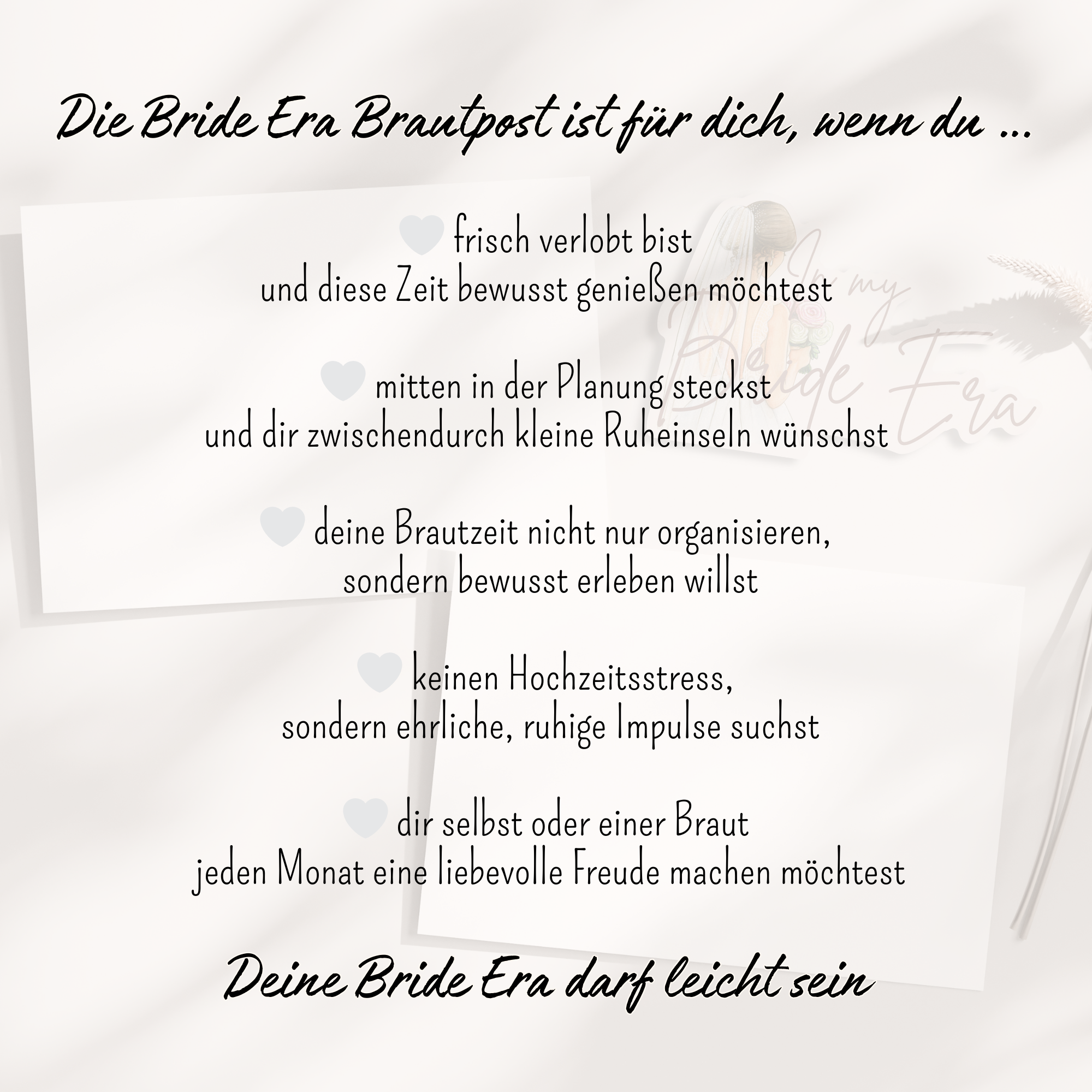 Die Bride Era Brautpost ist ein liebevoll gestaltetes Abo für Bräute, das dich Monat für Monat daran erinnert, deine Bride Era bewusst zu genießen – ganz ohne Hochzeitsstress, To-do-Druck oder Vergleich.
