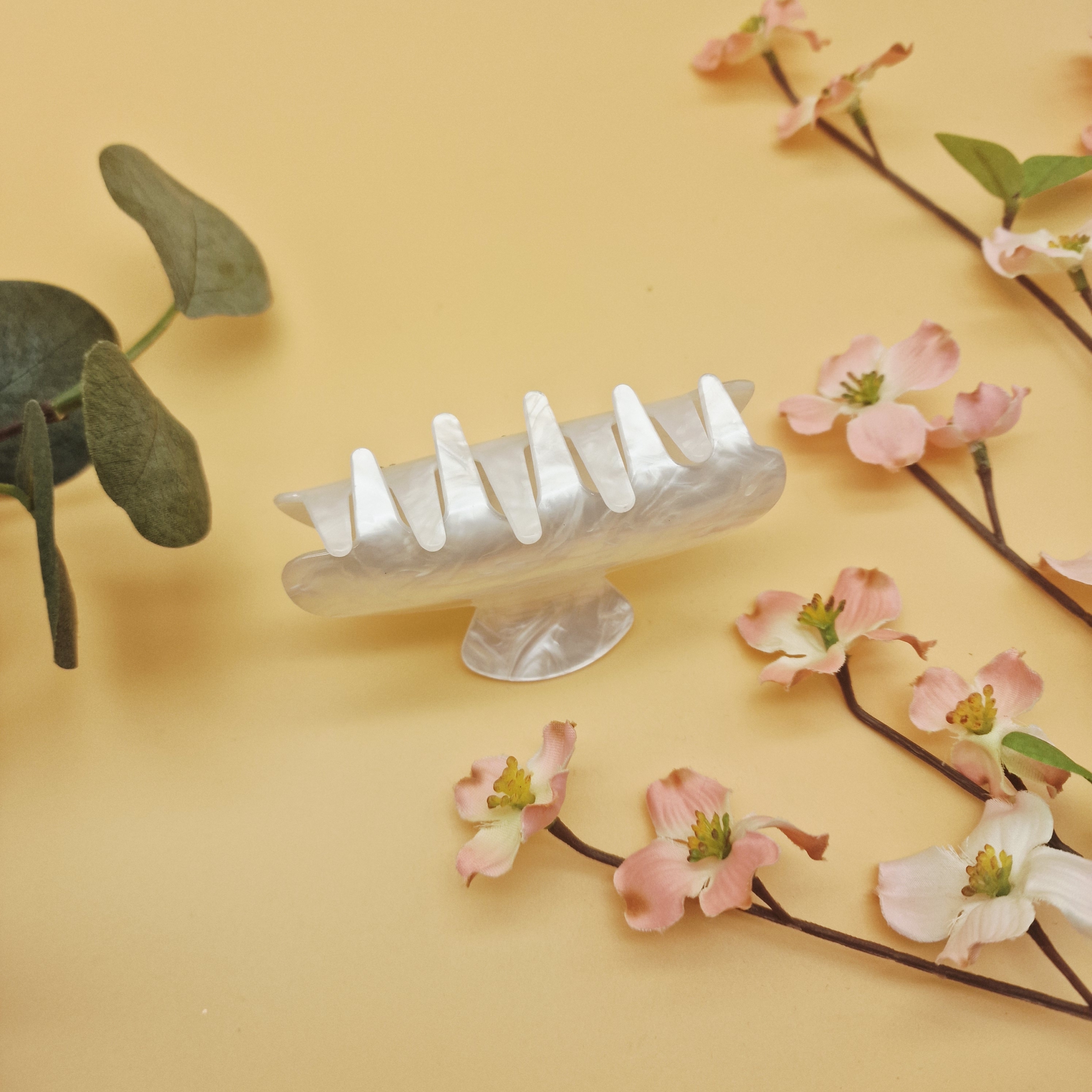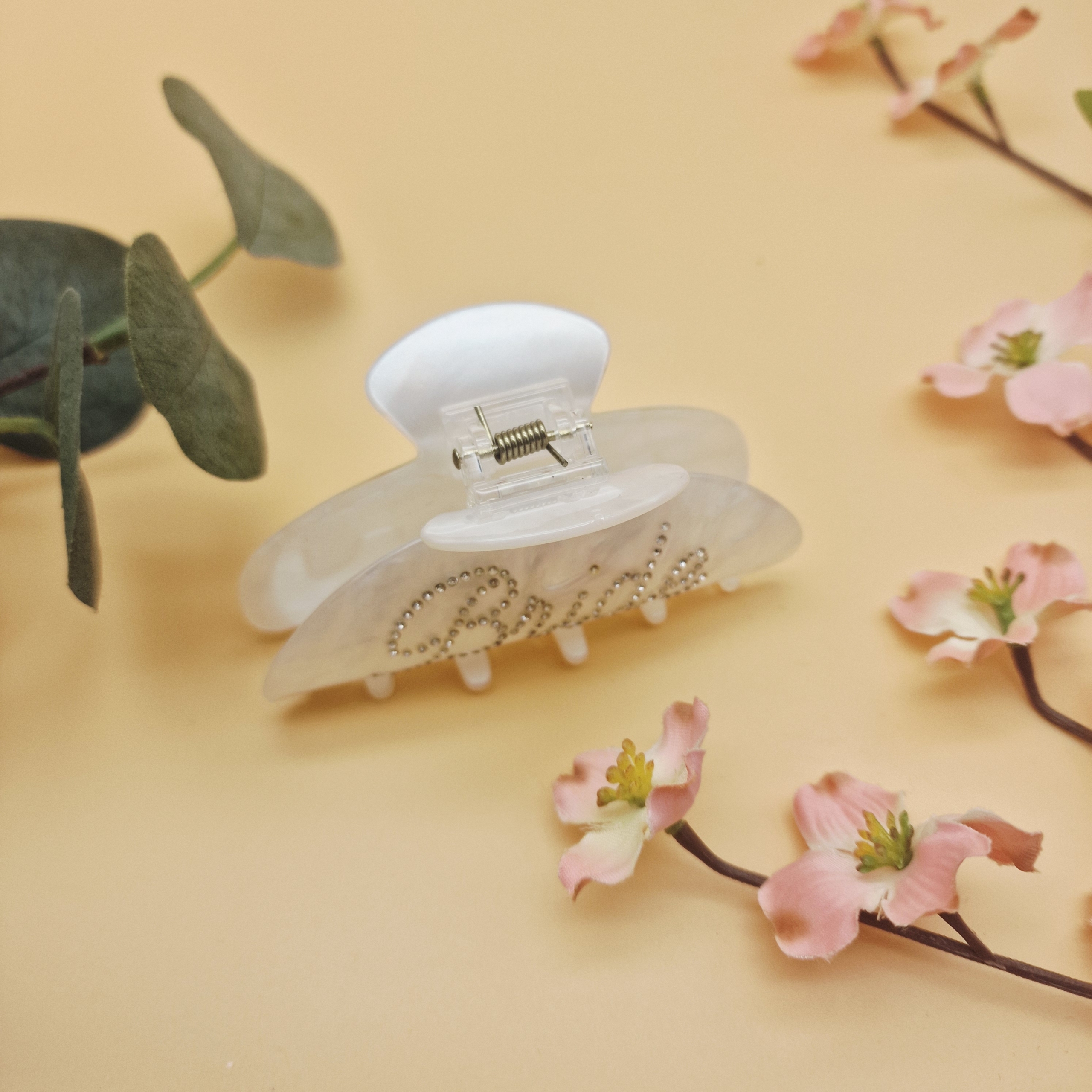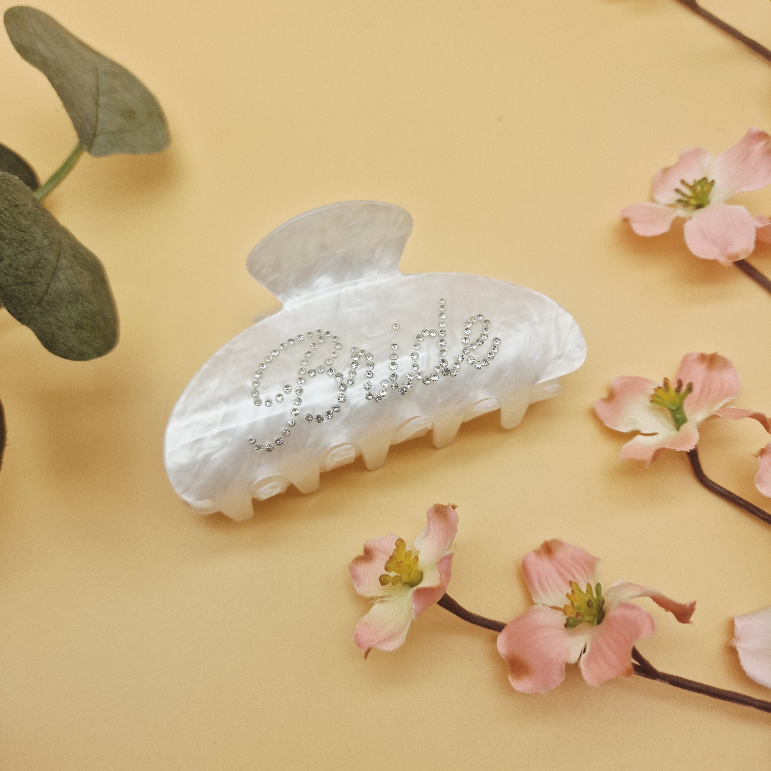 Die Haarklammer klein Bride ist ein wunderschönes Detail für alle zukünftigen Bräute, die schon vor dem großen Tag stilvolle Akzente setzen möchten. Mit ihrer edlen, weiß-marmorierten Oberfläche und dem funkelnden „Bride“-Schriftzug aus Strass ist sie ein eleganter Hingucker – dezent, aber mit einer klaren Botschaft.
