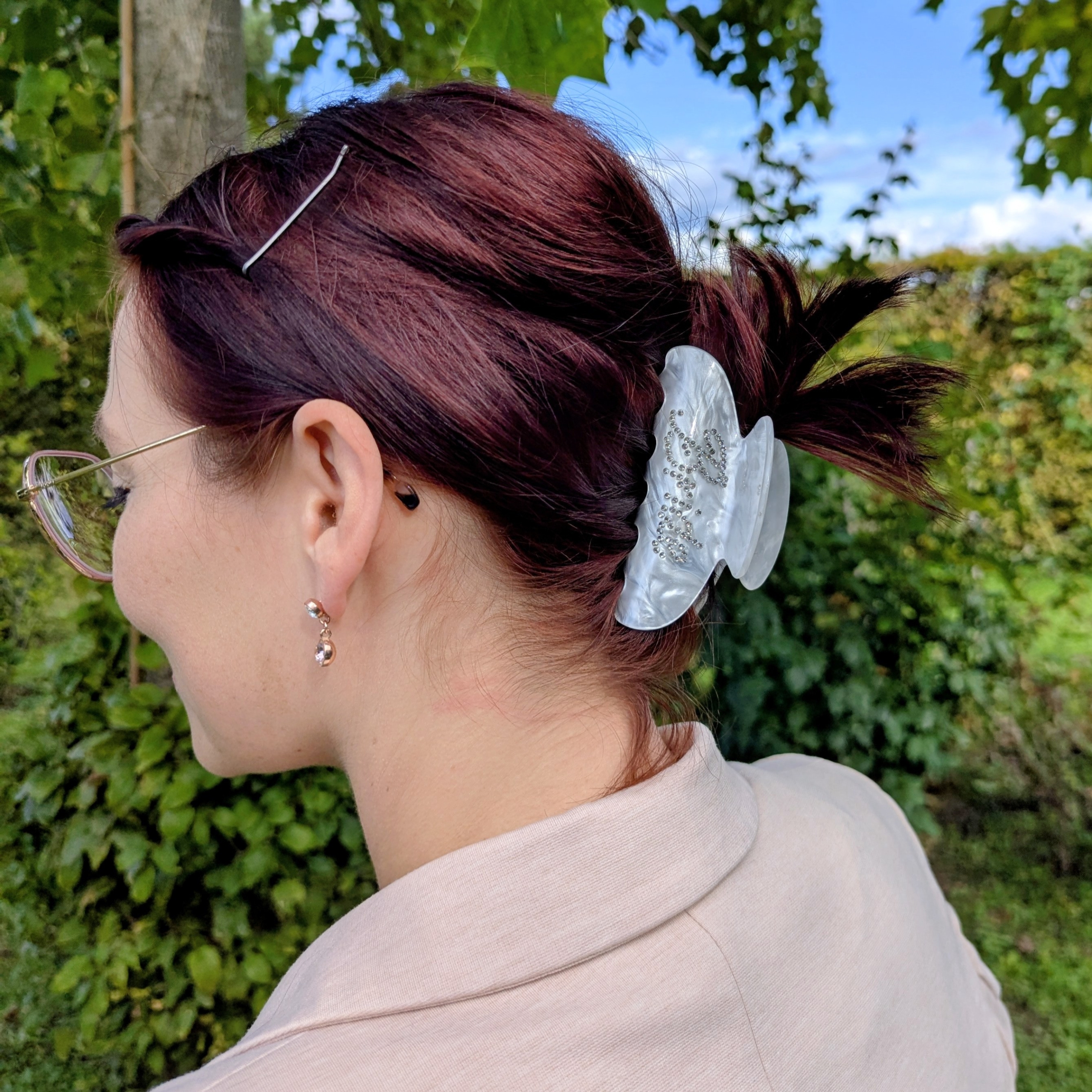 Durch ihre kompakte Größe ist die Haarklammer ideal, um einzelne Strähnen zu fixieren oder einen lockeren Half-up-Look zu stylen. Ob beim JGA, beim Kleid-Shopping, als süßes Detail im Brautkalender oder beim Getting Ready am Hochzeitstag – sie passt perfekt in jede Situation deiner Verlobungszeit.