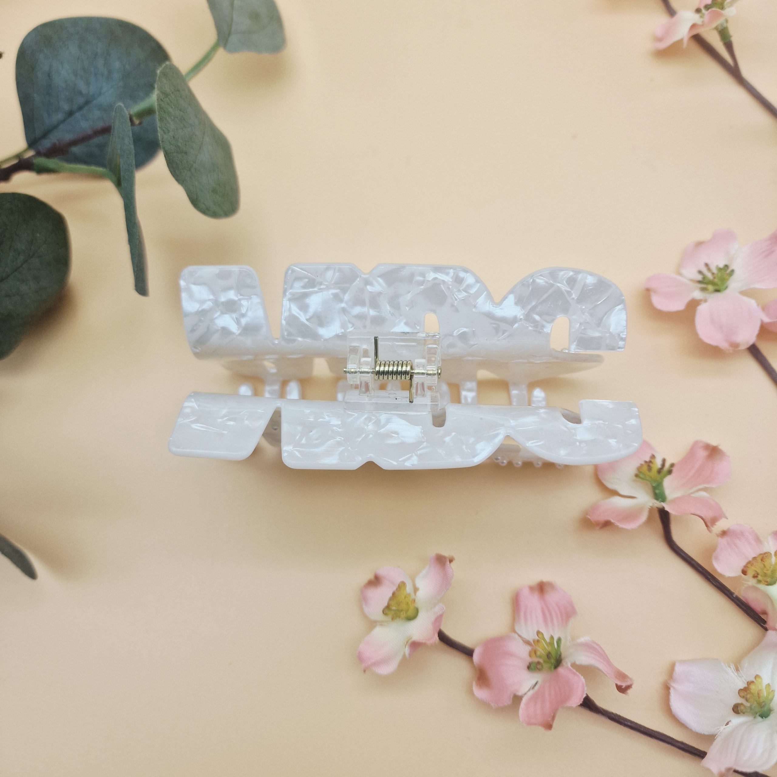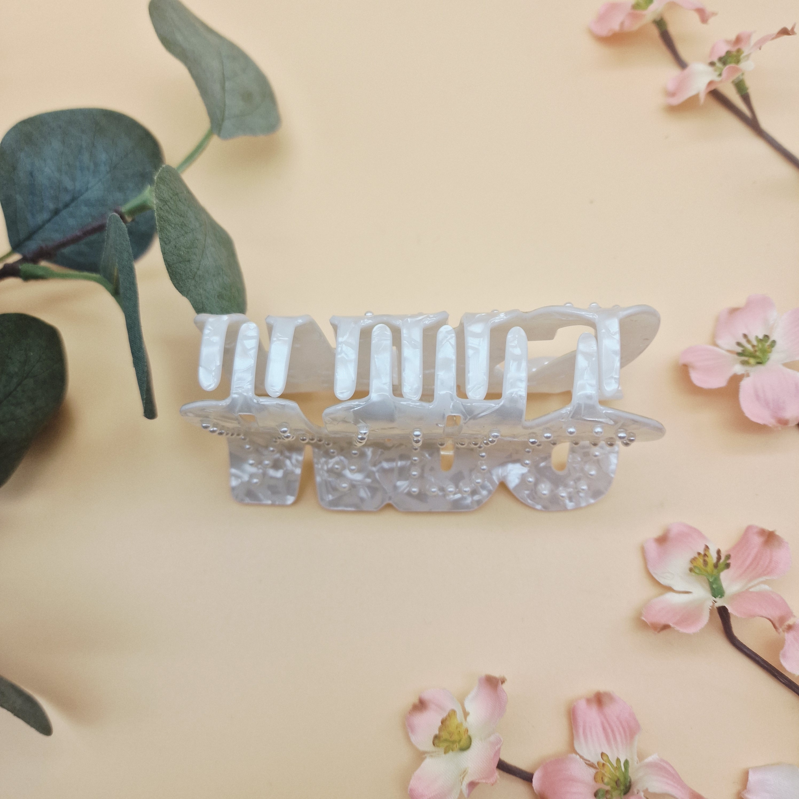 Die Haarklammer Mrs mit Perlen ist das ideale Accessoire für alle frisch verheirateten, die ihr Glück auch im Alltag elegant zeigen möchten. Mit ihrer edlen weiß-marmorierten Oberfläche, den feinen Perlen und dem beidseitigen „Mrs“-Schriftzug wird sie schnell zu deinem Lieblingsstück.