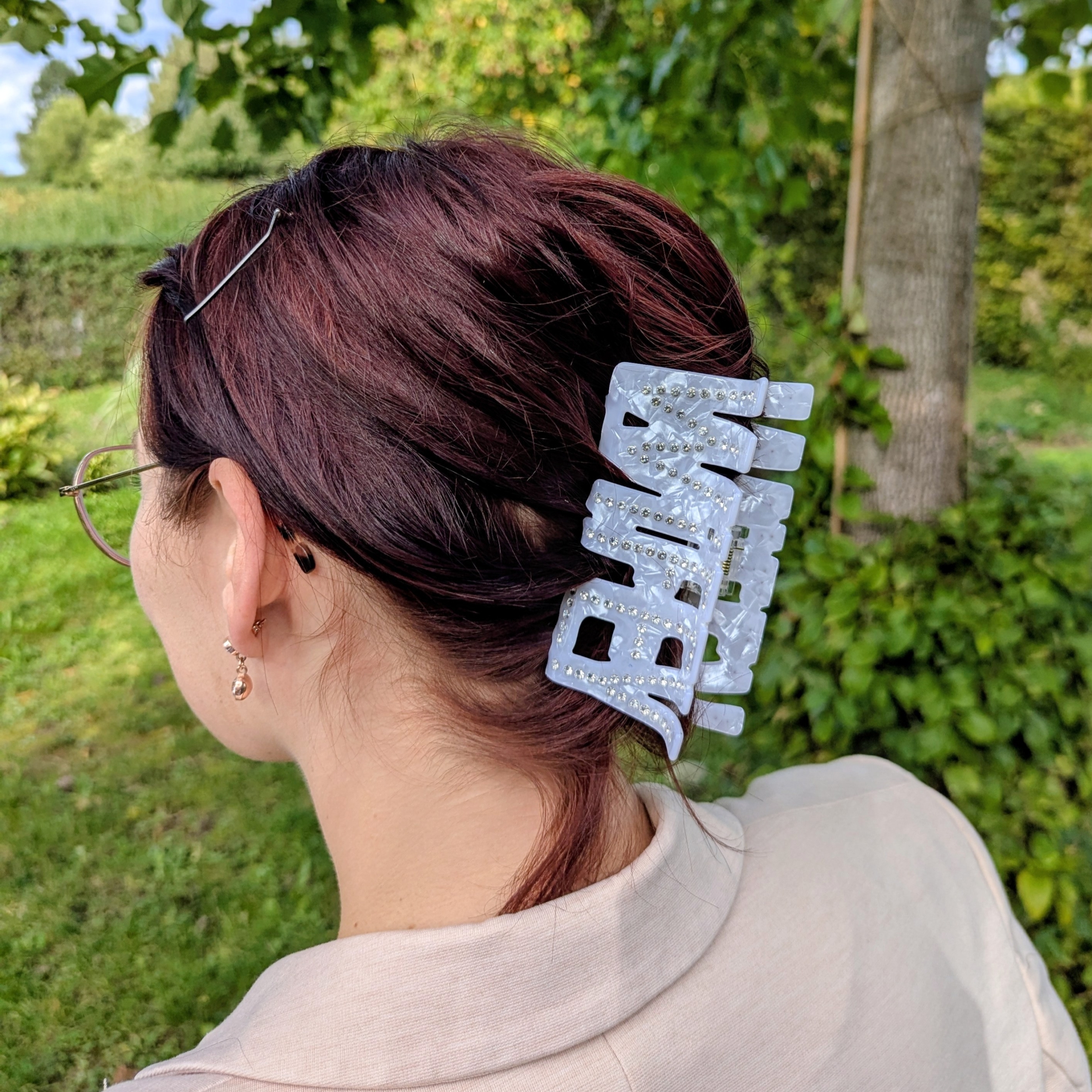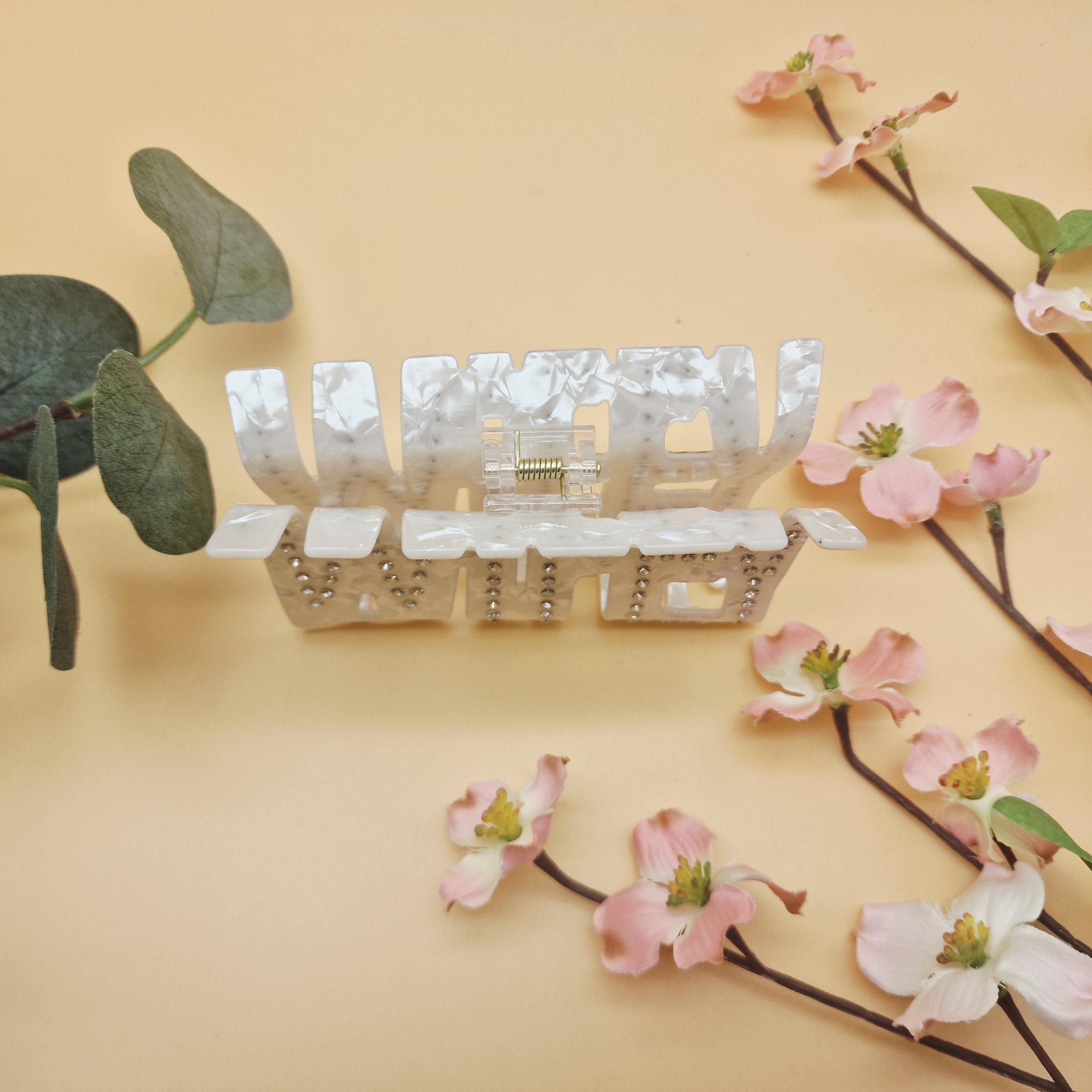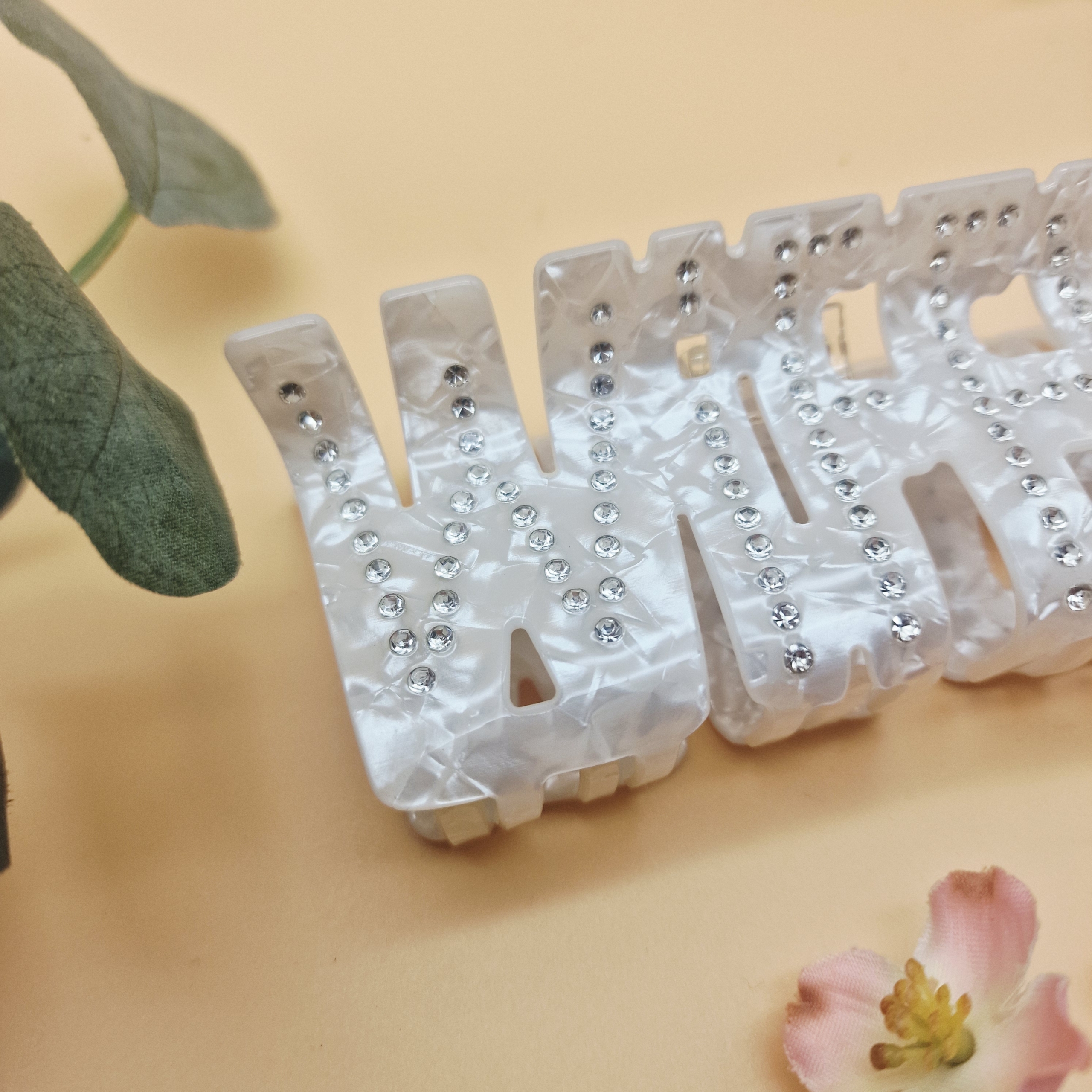 Die Haarklammer Wifey mit Strass ist das perfekte Accessoire für frisch verheiratete Frauen, die ihr Glück stilvoll nach außen zeigen möchten. Die Kombination aus weiß-marmorierter Oberfläche, funkelnden Strass-Steinen und dem beidseitigen „Wifey“-Schriftzug macht sie zu einem besonderen Hingucker, der sowohl praktisch als auch edel ist.