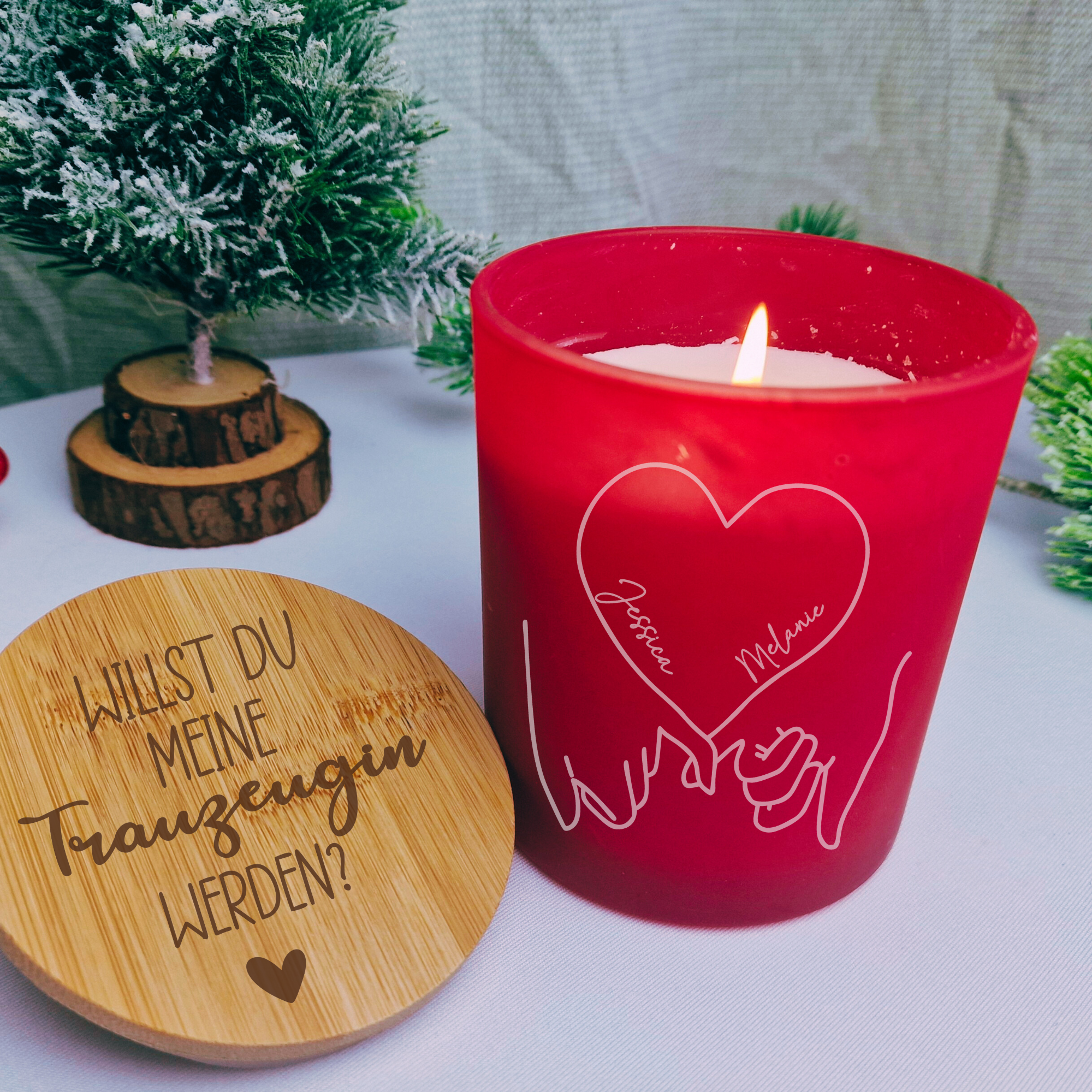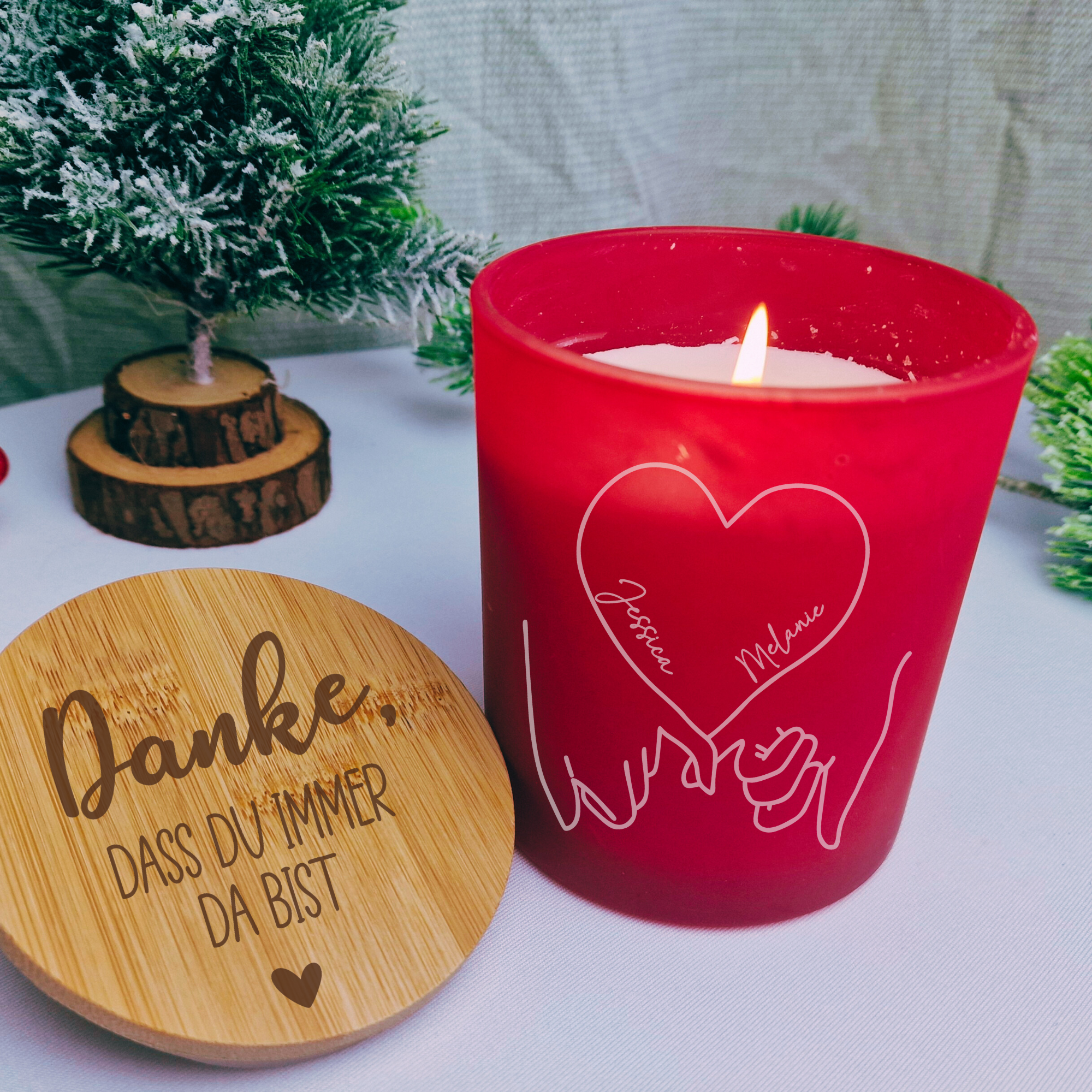 Auf dem roten Glas sind zwei Hände abgebildet, die gemeinsam ein Herz formen – ein Symbol für Liebe, Vertrauen und die unzertrennliche Verbindung zwischen zwei Menschen. Unter dem Motiv werden eure Namen eingraviert und machen jede Kerze zu einem ganz persönlichen Erinnerungsstück voller Herz.