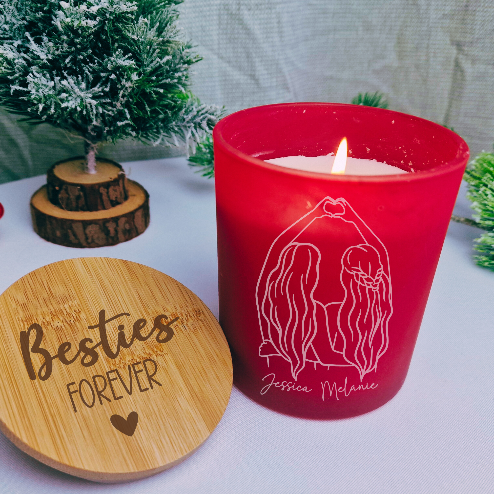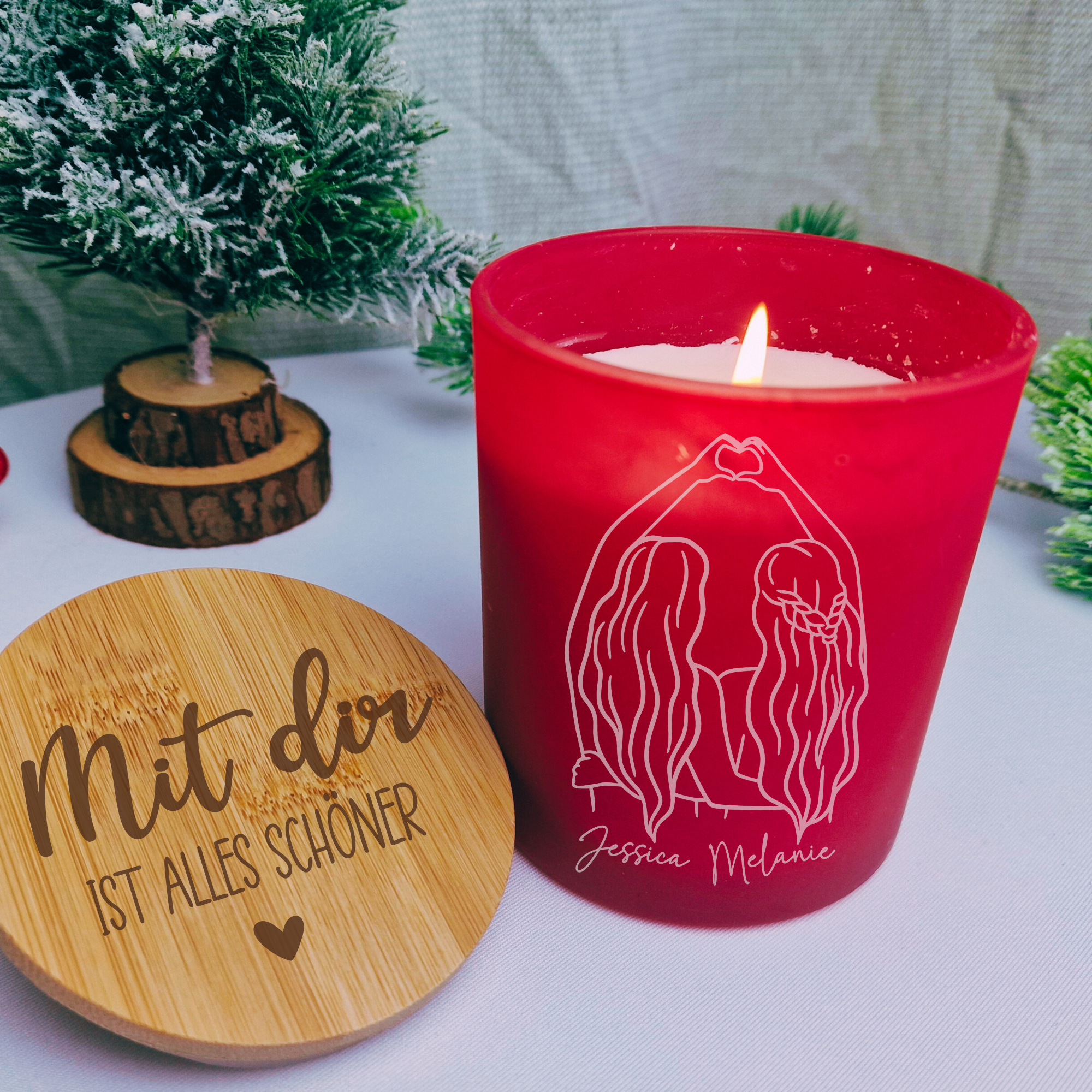 Auf dem roten Glas sind zwei Freundinnen mit Weingläsern abgebildet – ein modernes, stilvolles Motiv, das Verbundenheit, Freude und gemeinsame Erinnerungen widerspiegelt. Unter dem Motiv werden eure Namen eingraviert, wodurch die Kerze im Glas zu einem ganz persönlichen Geschenk wird.