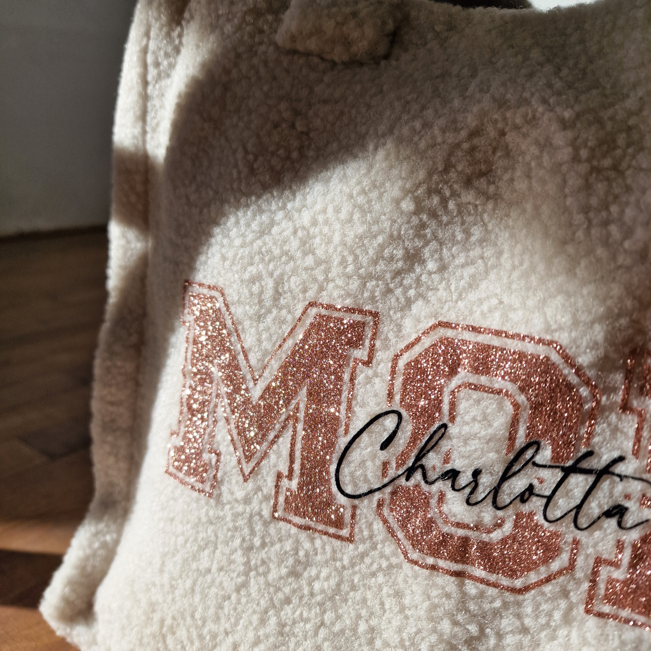 Mit ihrem modernen, kuscheligen Look und der hochwertigen Personalisierung trägt sie deine Geschichte direkt nach außen: MOM – veredelt mit dem Namen oder den Namen deiner Kinder. Jedes Stück wird so zu einem ganz persönlichen Herzensaccessoire, das dich überall hin begleitet: in die Stadt, zur Kita, zum Wochenendtrip oder einfach durch deinen Alltag.