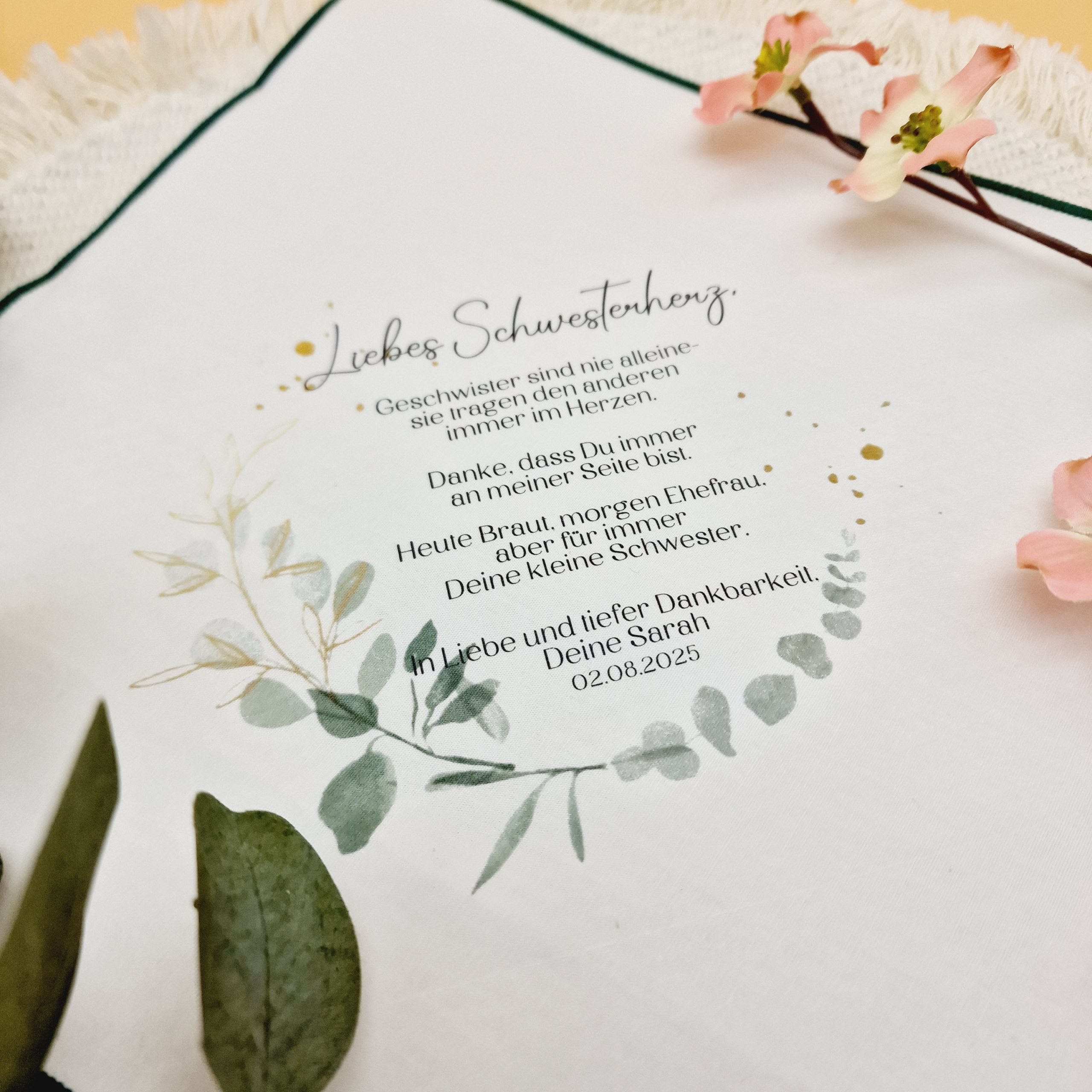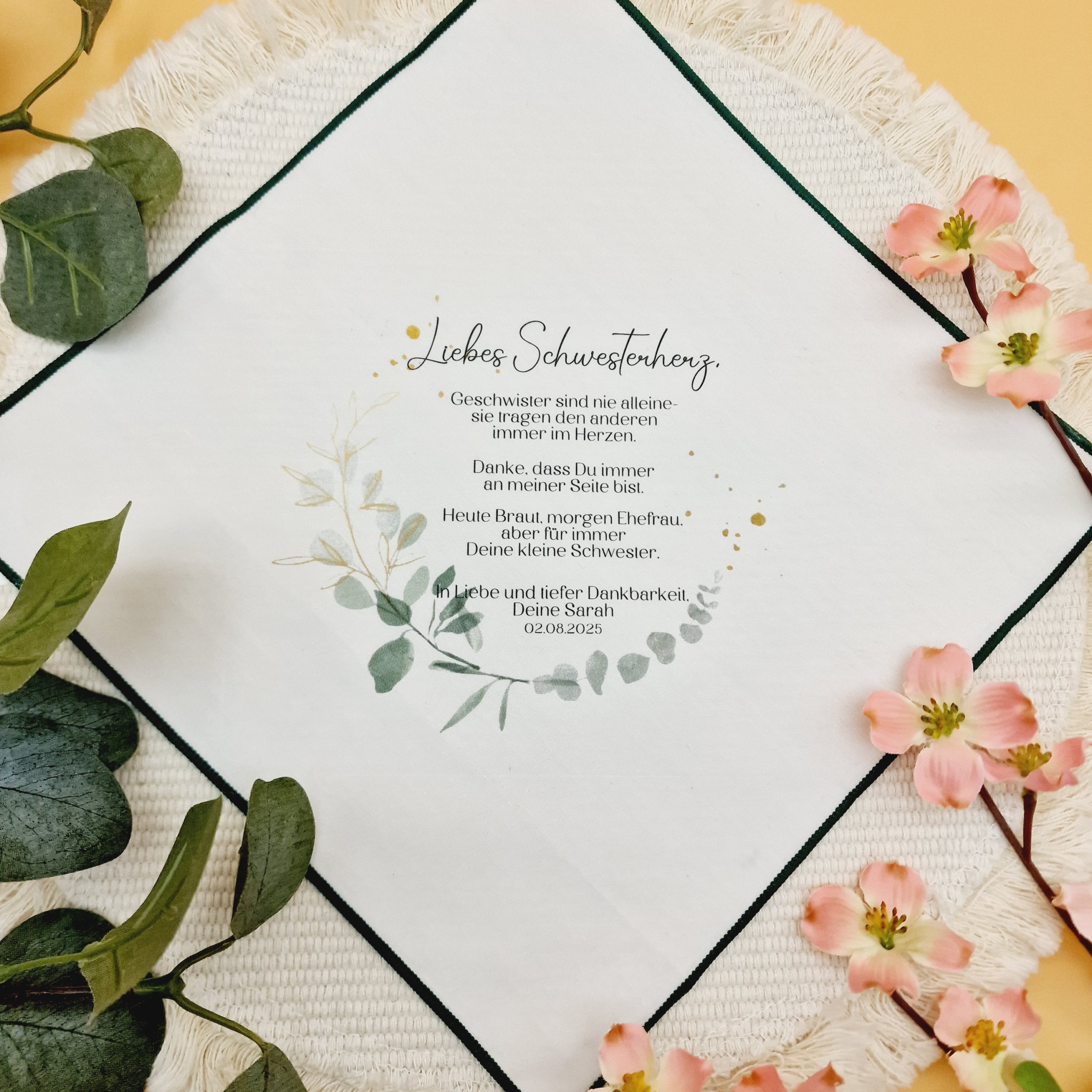 Dieses liebevoll gestaltete Taschentuch im eleganten Eukalyptus-Design ist das perfekte Geschenk für deine Schwester – als Erinnerung an einen ganz besonderen Tag voller Liebe und Emotionen. Es begleitet sie durch all die rührenden Momente der Hochzeit: wenn sie dich voller Stolz ansieht, Freudentränen verdrückt oder dich in einer innigen Umarmung festhält.